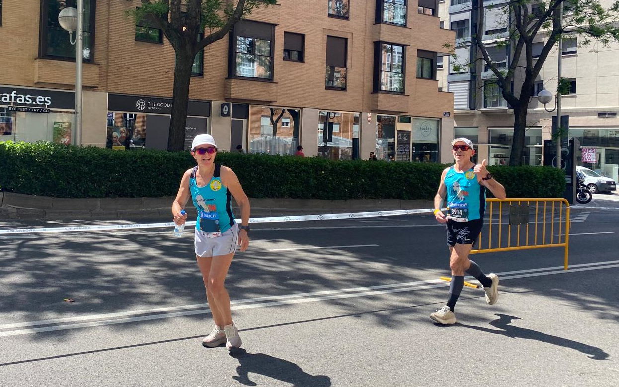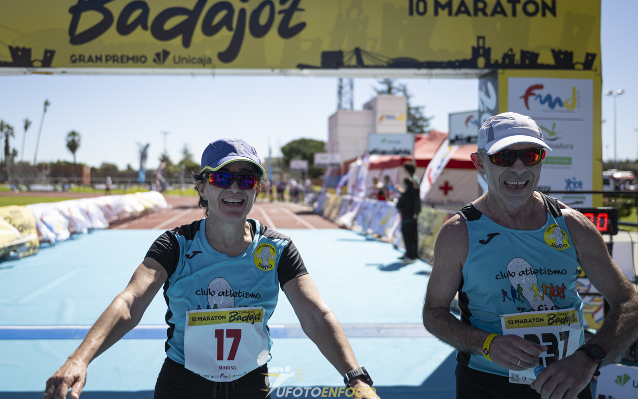 Por allí andaba Joaquín, que nos hizo unas fotos y me vinieron muy bien sus ánimos. Pensé que ya quedaban poco más de dos kilómetros y que la última caminata, que debería hacer por el kilómetro 41 me la iba a ahorrar, así que apreté los dientes y pensé que cuanto más deprisa fuera más pronto llegaría a meta, pero claro, una cosa es pensarlo y otra cosa es que te hagan caso las piernas, pero no me puedo quejar porque hice lo que me quedaba rondando los 5:30, nada mal. Llegué a meta con las dos compañeras agarrados de la mano marcando mi cronómetro un tiempo de 3:48:18, un poco mejor que un mes antes en Badajoz siendo un circuito más duro, con mucho calor… Y más largo, porque en la capital pacense me salieron casi 700 metros menos. Dar las gracias a las dos compañeras que fueron conmigo porque gracias a sus ánimos no desfallecí en ningún momento.