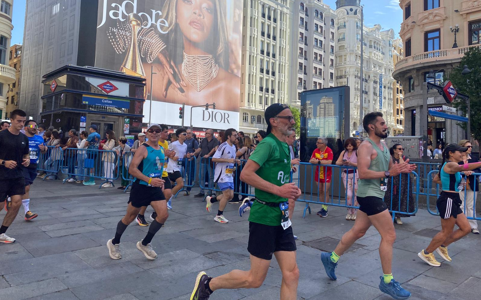 Transitando por Carranza iba mirando por si veía a mi hermana, lo que me causó una gran tristeza. Pasada la glorieta de San Bernardo, kilómetro 18, en plena cuesta abajo tocó ponerse a andar y aproveché para meterme la tercera carga, consistente en un gel de tamaño normal, todo consensuado con ChatGPT. Si la guayaba me cayó mal, el gel me cayó peor y empecé a notar el estómago mal y como un pinchazo en la tripa, entonces comprendí que lo de tomar geles o comer algo en carrera no me viene nada bien, quizás haya que entrenarlo o quizás lo mejor sea no tomar nada. Llegamos a Gran Vía y allí nos encontramos que ya iba gente andando subiendo ese duro repecho y no creo que fuese debido a que iban haciendo un Galloway. En Callao estaban los pradolongueros, que nos volvieron a animar, aunque alguno no se dio ni cuenta que pasamos. Por fin en Sol nos separamos de los de la media, ya que ellos giraban hacia la izquierda y nosotros hacia la derecha embocando la calle Mayor con su correspondiente repecho.