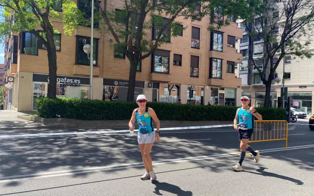 Por allí andaba Joaquín, que nos hizo unas fotos y me vinieron muy bien sus ánimos. Pensé que ya quedaban poco más de dos kilómetros y que la última caminata, que debería hacer por el kilómetro 41 me la iba a ahorrar, así que apreté los dientes y pensé que cuanto más deprisa fuera más pronto llegaría a meta, pero claro, una cosa es pensarlo y otra cosa es que te hagan caso las piernas, pero no me puedo quejar porque hice lo que me quedaba rondando los 5:30, nada mal. Llegué a meta con las dos compañeras agarrados de la mano marcando mi cronómetro un tiempo de 3:48:18, un poco mejor que un mes antes en Badajoz siendo un circuito más duro, con mucho calor… Y más largo, porque en la capital pacense me salieron casi 700 metros menos. Dar las gracias a las dos compañeras que fueron conmigo porque gracias a sus ánimos no desfallecí en ningún momento.